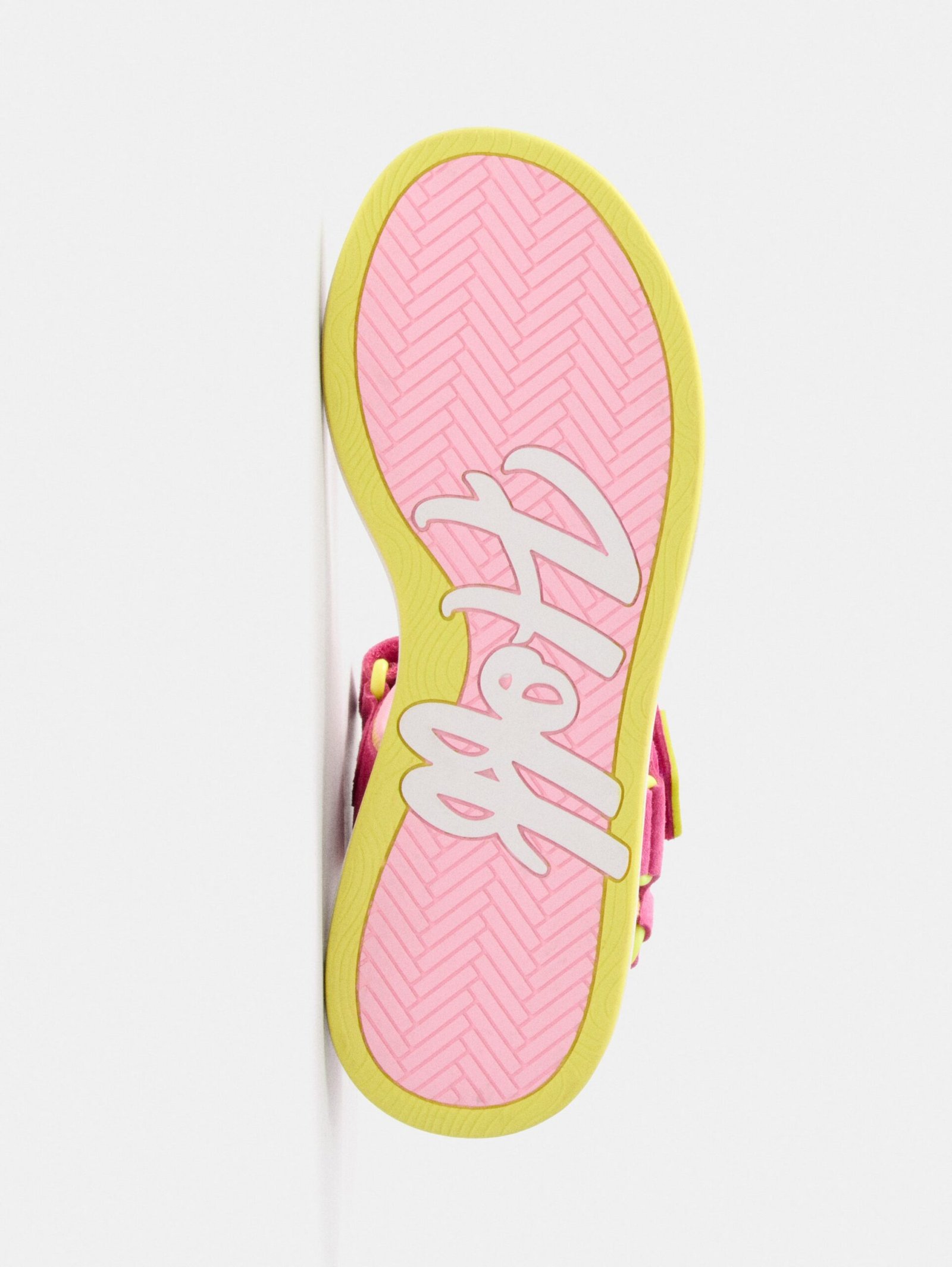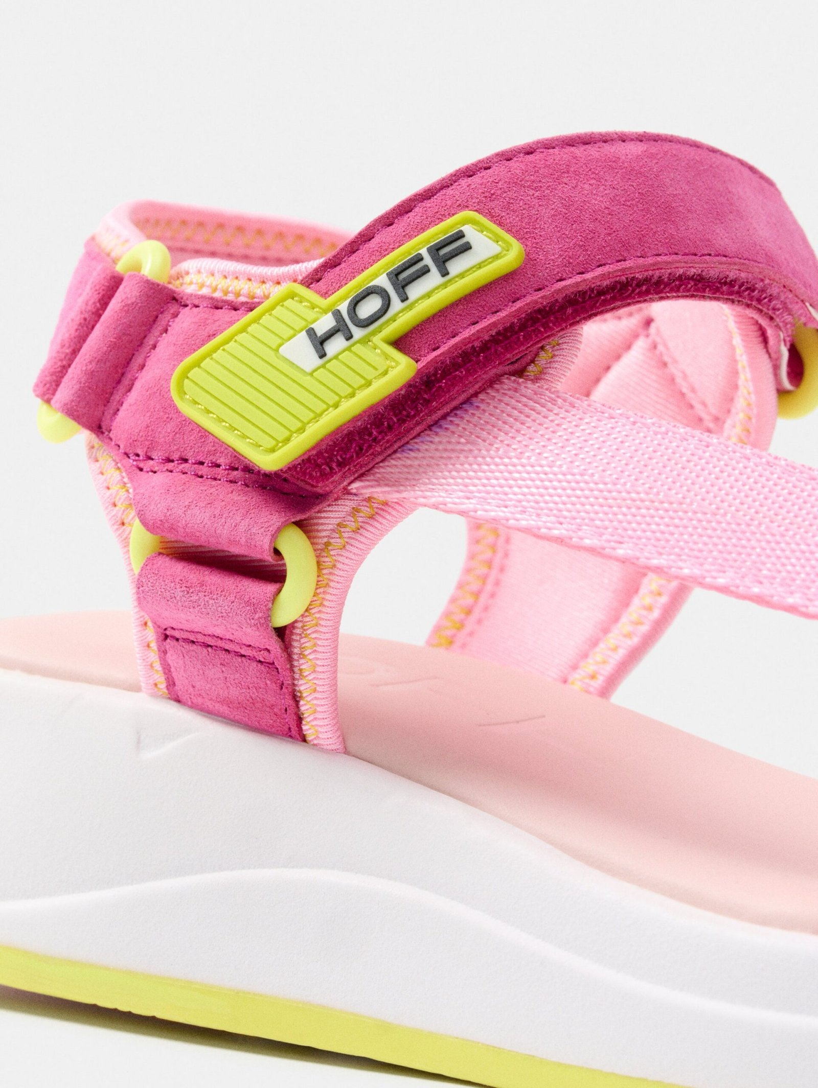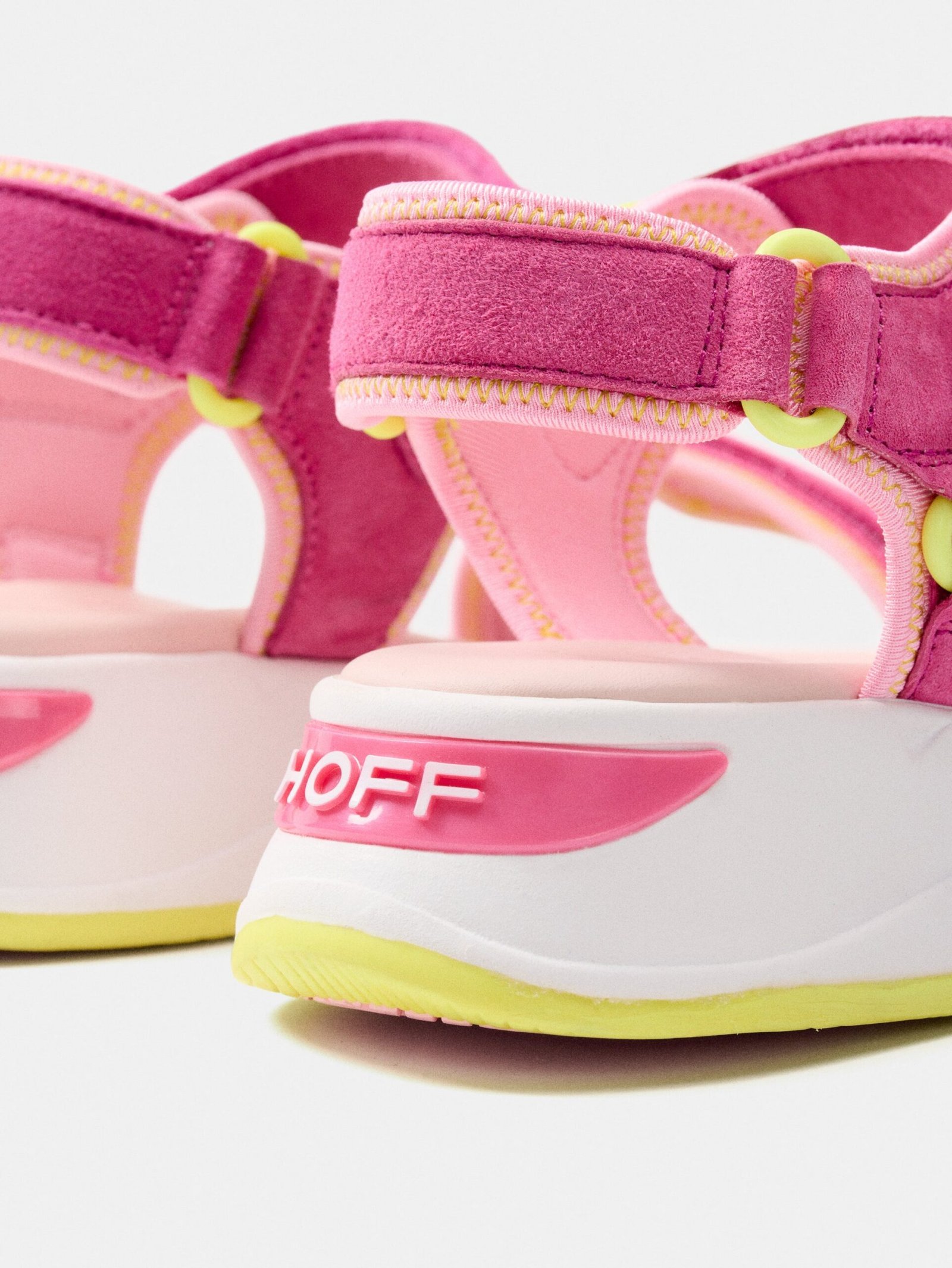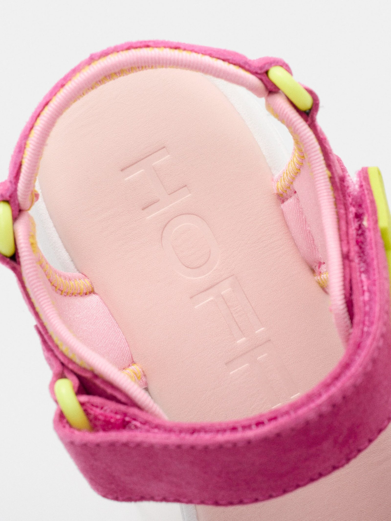 A delicate and elegant look inspired by the magical island of AKAMARU! With suede in fuchsia perfectly balanced with pastel pink and details in matching rubber and lime green. these sandals become a must-have for sunny days. Not only are they an authentic piece. but they also ensure comfort thanks to the memory foam insole and padded lining. Ideal for strolling on summer afternoons. enjoying a day of sangria with friends. or looking chic in the office. Remember. these sandals are not made for getting wet.
