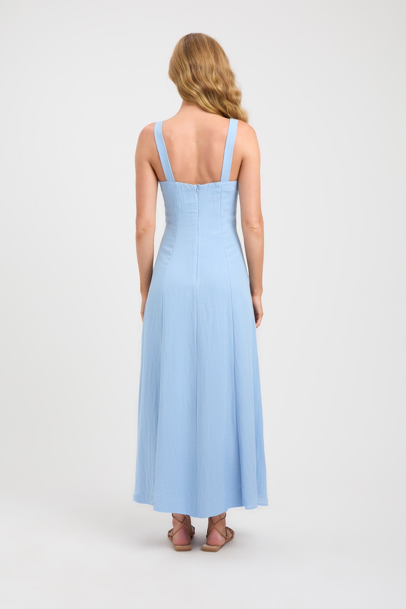 Arriving in a dreamy blue colourway. the Hayman dress showcases classic elegance with its flowy silhouette and detailed neckline. This midi-length dress is crafted from our Hayman fabrication enabling effortless drape over the body. Detailed with a rouched underbust. this vee-neck style draws attention to the neckline with its self-tie feature. This fit-and-flare style secures with an invisible zip at the back.