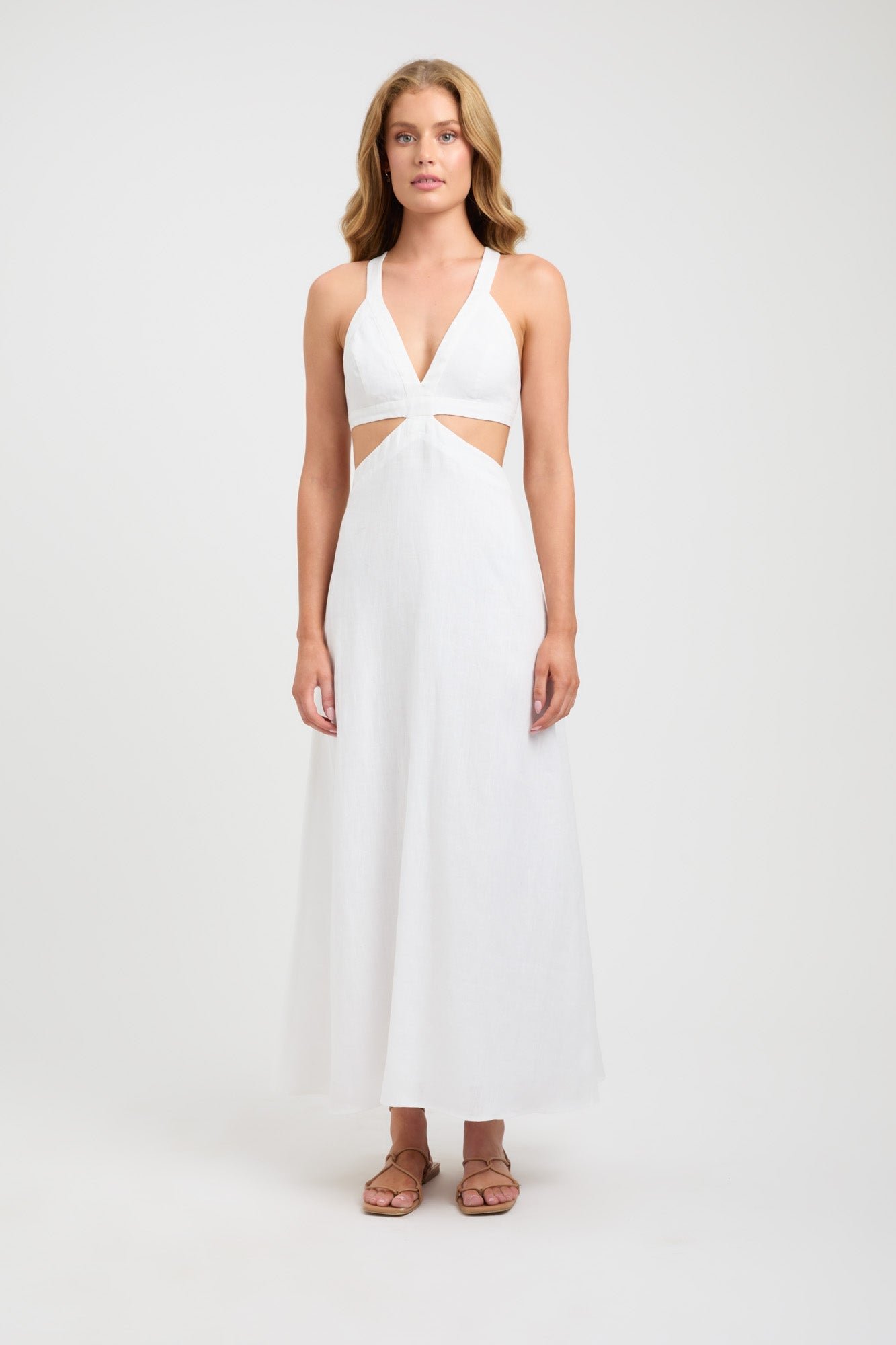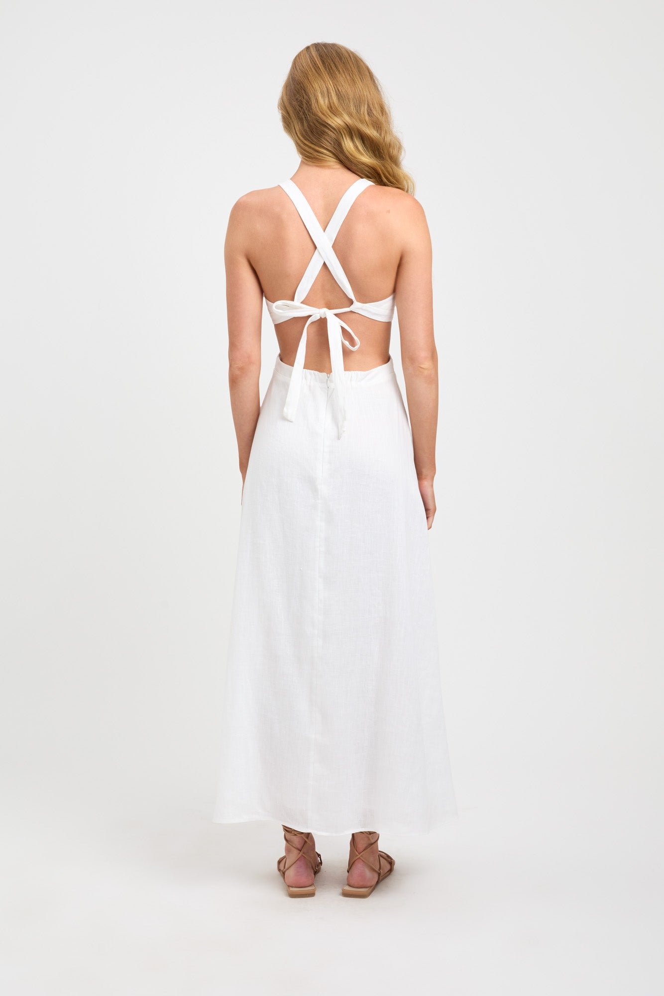 Keep the holiday mood with this cut-out dress. An addition to our Tahiti Linen range. this midi style evokes comfort and wearability. The fit-and-flare silhouette is anchored with a vee neckline and fitted bust. A cut-out design. this midi dress exposes the skin underneath the bust and on the back with a cross-over tie to secure.